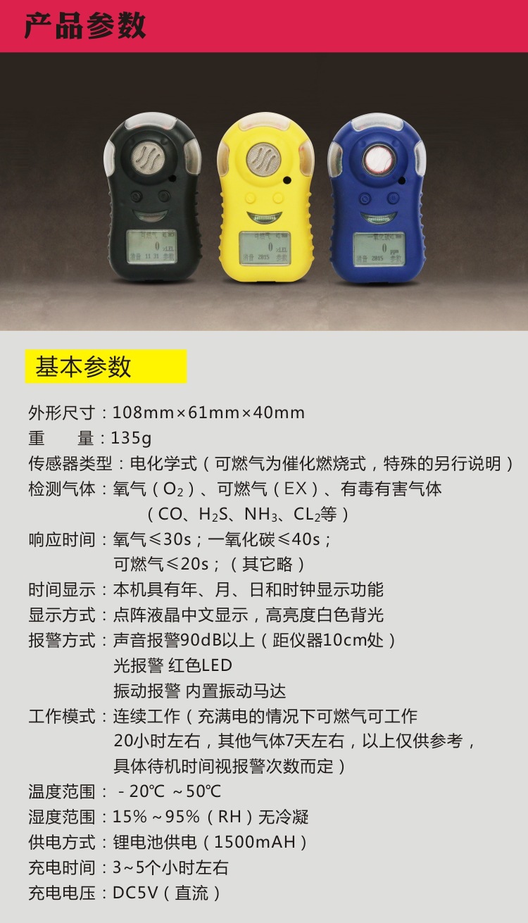 便攜式單一氣體檢測(cè)儀,是一種可連續(xù)檢測(cè)作業(yè)環(huán)境中有毒有害、易燃易爆氣體濃度的儀器。檢測(cè)儀為自然擴(kuò)散方式檢測(cè)氣體濃度,采用進(jìn)口傳感器,具有良好的靈敏度和出色的重復(fù)性;開機(jī)自動(dòng)檢測(cè),具有***的自診斷和自修復(fù)功能;儀器采用嵌入式微控制技術(shù),菜單操作簡(jiǎn)單,功能齊全,可靠性高,具有多種自適應(yīng)能力;使用液晶漢字顯示屏,直觀清晰;故障及欠壓指示,屏幕顯示可旋轉(zhuǎn)180度,可方便不同習(xí)慣者使用,人體工學(xué)設(shè)計(jì),握感舒適、操作簡(jiǎn)單。本儀器可以保存3000條報(bào)警記錄,可按鍵查看或者通過USB接口將數(shù)據(jù)傳輸至計(jì)算機(jī),配上位機(jī)軟件后可進(jìn)一步分析;可設(shè)置報(bào)警點(diǎn)、標(biāo)定、以及讀取、打印、保存報(bào)警記錄等;1500mAh大容量鋰電池,大大提升設(shè)備續(xù)航時(shí)間;采用USB接口充電,通用充電器充電方便。