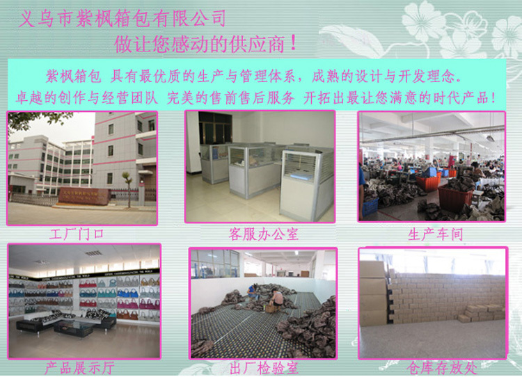 主要從事生產(chǎn)、加工、銷售等業(yè)務(wù),公司擁有一批銷售業(yè)務(wù)精英及技術(shù)***的設(shè)計人員,開發(fā)時尚箱包、手提包,手袋、化妝包,禮品袋、無紡布袋,帆布袋,時裝包,冰包、野餐包 ,零錢包,筆袋,手機(jī)袋,手機(jī)繩,電腦包,登山包等,產(chǎn)品款式新穎,***,價格優(yōu)惠,竭誠為廣大客戶提供優(yōu)質(zhì)服務(wù)。經(jīng)過多年的不懈努力,公司現(xiàn)已建立良好的銷售網(wǎng)絡(luò),產(chǎn)品遠(yuǎn)銷世界各地,深受國內(nèi)外客戶的好評。公司有專門人員注意收集***市場的各種流行趨勢和時尚信息,因此我們每周都會推出新的款式來滿足不斷變化的市場需求.我司也竭誠歡迎你的來樣定做和貼牌生產(chǎn).我們的服務(wù)宗旨:以“客戶,質(zhì)量,信譽(yù)至上”為經(jīng)營宗旨,公司實力雄厚、設(shè)備齊全、可開17%的增值稅***,歡迎新老客戶來人來電洽談業(yè)務(wù),真誠合作,共創(chuàng)輝煌 做讓您感動的供應(yīng)商!