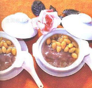 銀杏仁(去殼后用沸水燙去內(nèi)種皮)6-10粒,冰糖少量,粳米2兩,水適量,同時(shí)放入鍋中,文火煮熟即成。以粳米成糊糜狀即可。