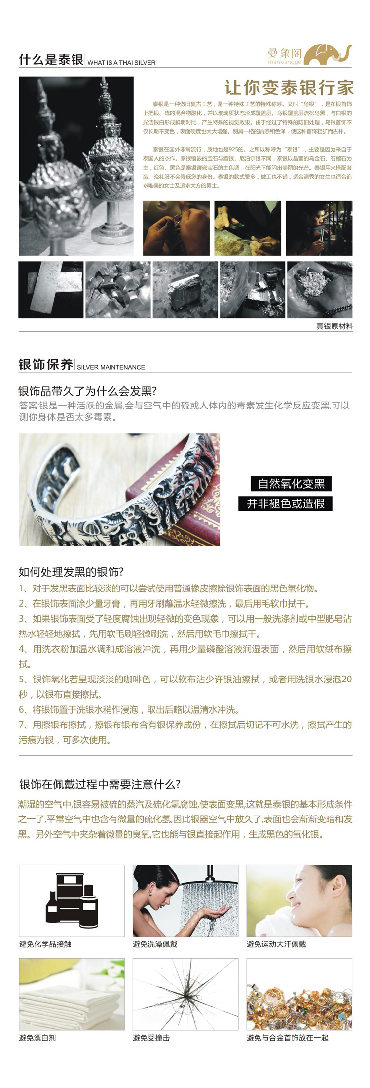 泰銀,概念上就是925純銀,(泰銀是一種做舊復(fù)古工藝,含銀量包含92.5%,99%,99.9%,純度高的比較少出現(xiàn))只是一種特殊工藝的特殊稱呼。又叫“烏銀”,是在銀首飾上把銀、硫的混合物融化,并以玻璃質(zhì)狀態(tài)形成覆蓋層。烏銀覆蓋層疏松烏黑,與白銀的光潔銀白形成鮮明對(duì)比,產(chǎn)生特殊的視覺(jué)效果。由于經(jīng)過(guò)了特殊的防舊處理,烏銀首飾不僅長(zhǎng)期不變色,表面硬度也大大增強(qiáng)。別具一格的質(zhì)感和色澤,使這種首飾粗獷而古樸。