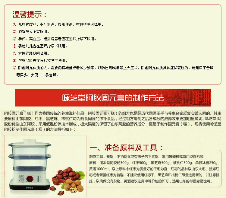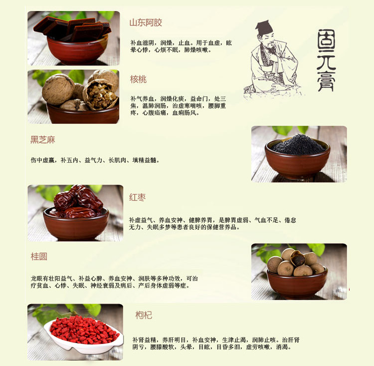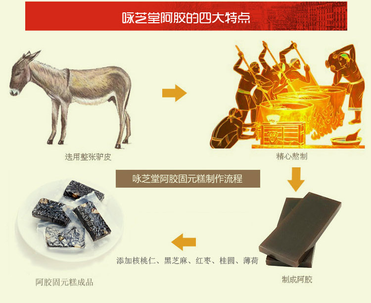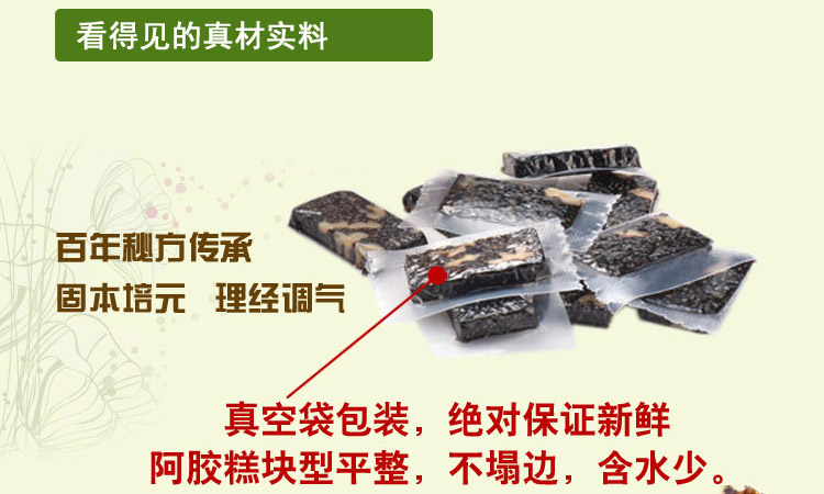 產(chǎn)品介紹:***地道山東阿膠,輔以黑芝麻、核桃仁、紅棗、桂圓、冰糖、黃酒等名貴中