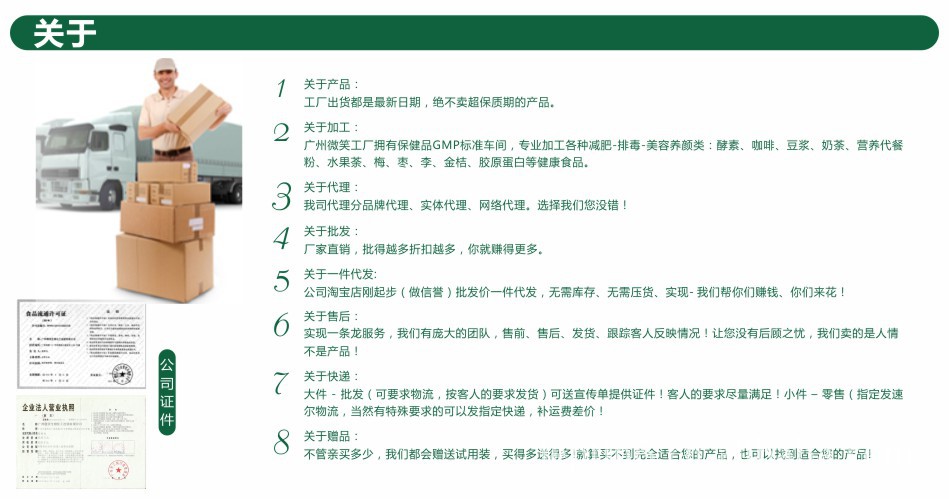 廣州微笑公司總部設(shè)在廣州白云區(qū),生產(chǎn)基地8000平方米,擁有保[jian]品GMP標(biāo)準(zhǔn)車間及進口大型***生產(chǎn)設(shè)備。我司具有超過六年的研發(fā)及GMP生產(chǎn)經(jīng)驗,成功接待歐美,日本,中東等***及地區(qū)的訪客,并簽訂供貨協(xié)議。公司專業(yè)生產(chǎn)、加工、批發(fā)各種酵素、咖啡、豆?jié){、奶茶、代餐包、水果茶、袋泡茶、梅子、李子,棗、金桔、膠原蛋白、葉黃素等健康食品。我們相信,憑借***的生產(chǎn)設(shè)備及經(jīng)驗豐富的生產(chǎn)與開發(fā)能力,***能夠為您提供您所需的高質(zhì)量產(chǎn)品。竭誠歡迎各界朋友蒞臨我司參觀、指導(dǎo)和業(yè)務(wù)洽談。