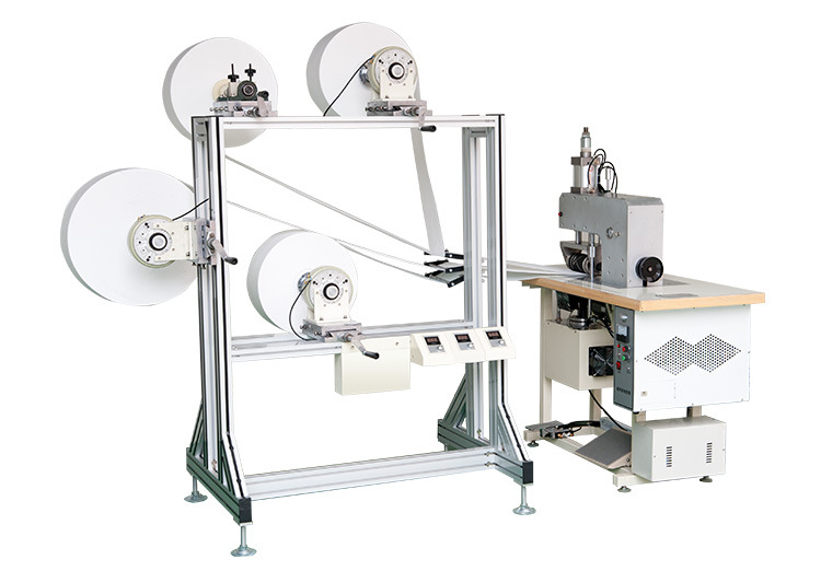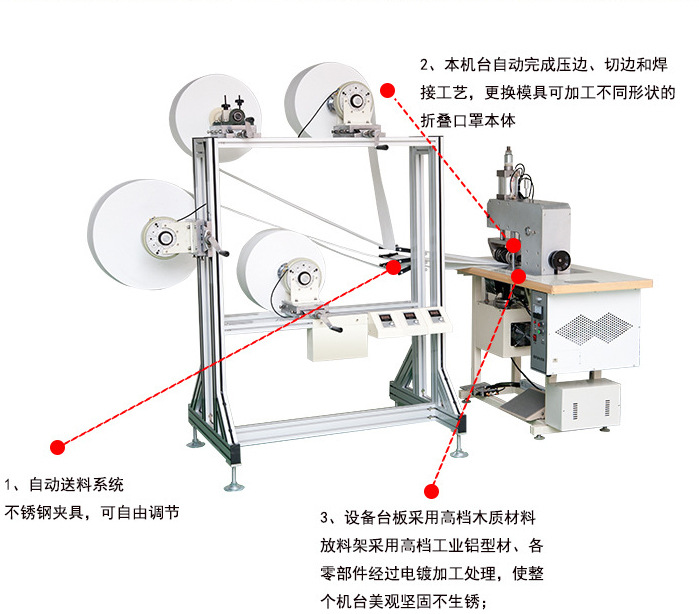 1、本機臺自動完成壓邊、切邊和焊接工藝更換模具可加工不同形狀的折疊口罩體;