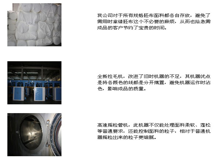 我公司主要經(jīng)營產(chǎn)品有:各款搖粒絨(染色,印花,彈力,壓花,復(fù)合);剪毛絨(染色,印花);單雙面絨(染色,印花);珊瑚絨,舒棉絨,三線衛(wèi)衣絨等針織面料,自己底下工廠***,其產(chǎn)品適用于服裝、玩具、裝飾、床上用品、手套等制造用料。竭誠歡迎海內(nèi)外各界朋友前來洽談業(yè)務(wù)!