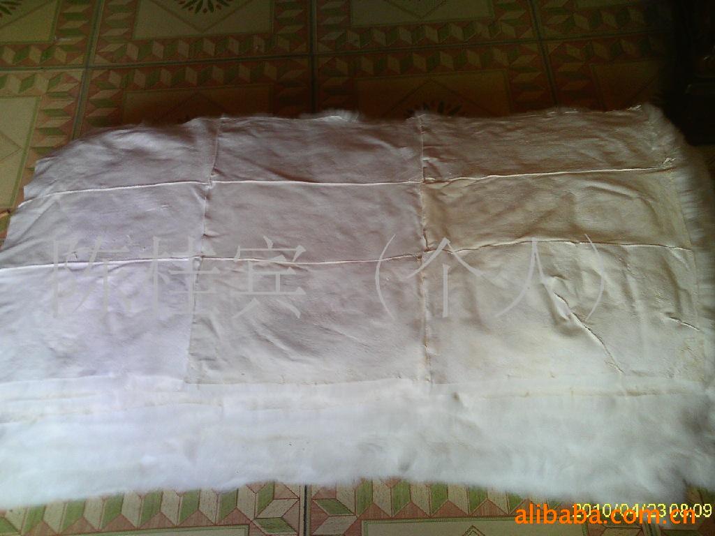 這是用進(jìn)口兔皮做成的褥子、尺寸是110cm*52cm、顏色有青色、白色、草色、還可以染色、還可以染成客戶(hù)需要的各種顏色