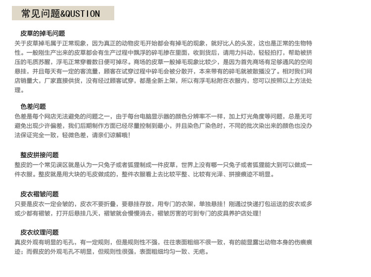 1皮草是自然生長(zhǎng)的產(chǎn)品,是自然的,天生的,沒(méi)有的皮草,沒(méi)有一模一樣的皮草,就如天下沒(méi)有相同的2片樹(shù)葉。那種要求和樣品一模一樣的客戶(hù)繞行。皮草不是機(jī)器做的,不是磨具出的。我們沒(méi)有那個(gè)能力制造那么多的一模一樣的模樣好看,毛絨充盈的尾巴,就如上帝沒(méi)有辦法制造那么的美女。