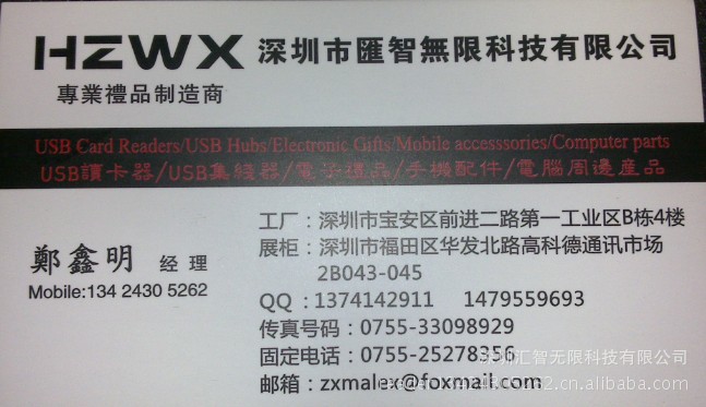 深圳匯智無限科技有限公司是***生產(chǎn)讀卡器、HUB、插卡音箱現(xiàn)代化工廠??倧S位于潮州市饒平縣上林工業(yè)區(qū)36棟6樓,分廠位于深圳市寶安區(qū)前進二路工業(yè)區(qū)東區(qū)4樓。