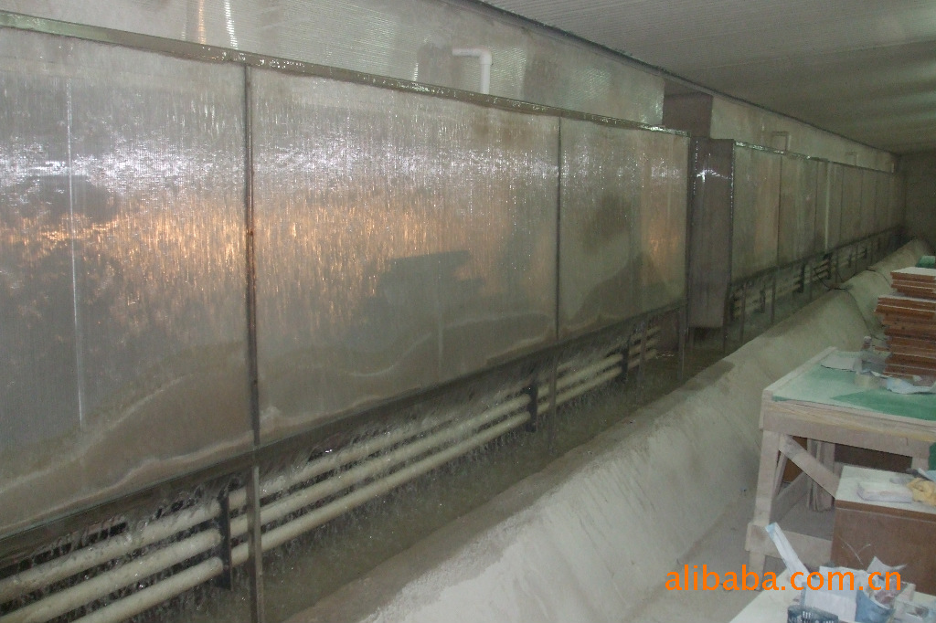 針對以上問題我們采用大風量、低風速作為工作位的抽風換氣,首先將其工作位處于導風板之下,當開動抽風機時,干凈空氣從工人身后吹向風機。由于我們在風機前方設置了全工作位長度水簾,吸風口風速控制在1.5m/s以下,當含塵氣流被很慢地吸到風口時,首先和1米高的水簾作接觸,被次吸附除塵,當含塵氣體進入吸風口后被循環(huán)水簾不斷向下到風口時所形成是水膜沖擊向下,到水池中作第二次除塵。