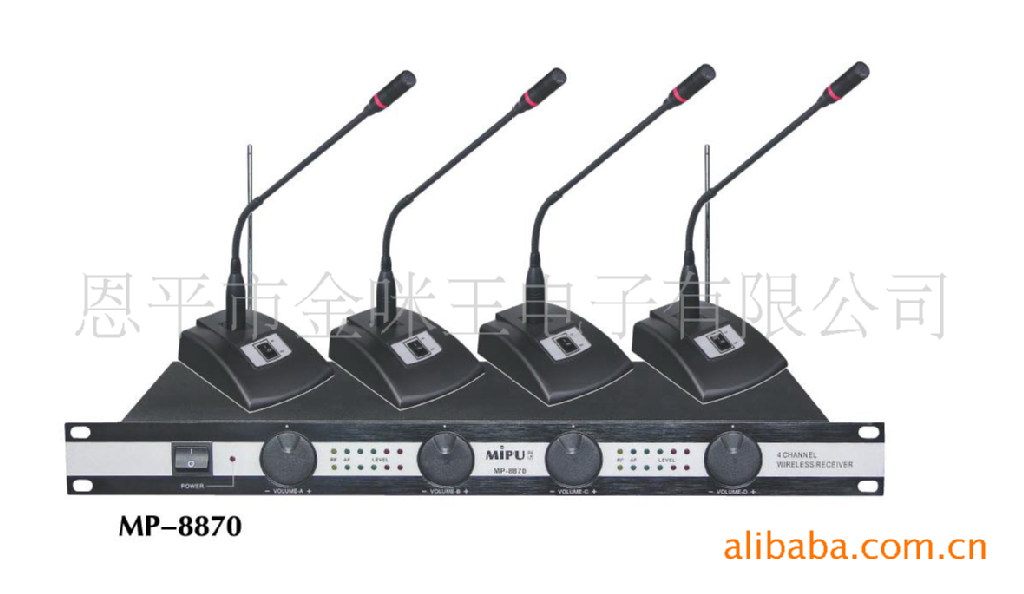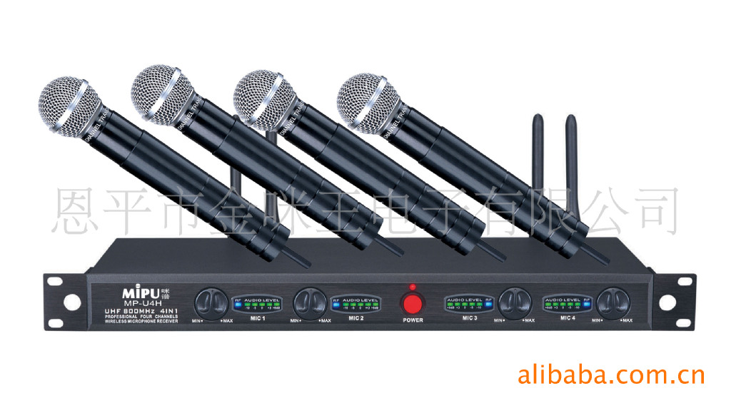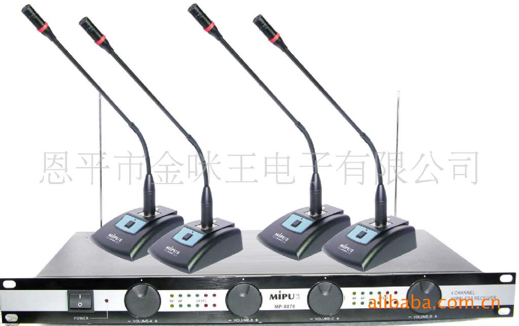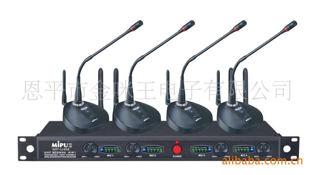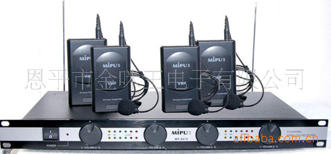 MIPU咪譜 MP-U4M無線會議麥克風在在不同的環(huán)境下同時使用均不受干撓,適合會議室使用,可同時使用三套不同的頻率無線會議麥克風;MP-U4MWIRELESS MICROPHONE FEATURE: *UHF 800MHz band and 4 applied channels with 300KHz channel space. *Fixed frequency, have very high receive sensitivity. *Excellent SAW filter for RF and IF circuit, are excellent anti-jamming performance. *Manufactured by SMT components and technics, each product had passed through aging test for 8 hours. *Collocating all-pervading AA size batteries for transmitter, continuous supply time up to 10~30 hours. *Dual DC-DC step up circuit for transmitter, RF output will not weaken when batteries power reduce. *Up to 150 meters operation distance in perfect environment, fitting for conference situations. SPECIFICATIONS: Frequency Range: 730~950MHz Selectable Channels: 4X1 Oscillation Mode: PLL synthesized Frequency Stability: ±10ppm Receive Mode: Superheterodyne Input Sensitivity:-90dBm Audio Response: 40Hz~ 2KHz T.H.D.at 1kHz: ≤0.5% Signal to Noise Ratio: ≥110dB Audio Output: Balanced XLR Unbalanced 1/4” jack socket RF Output: 10Mw (50Nw Max.) Modulation Mode: FM Battery Requirement: 2*1.5AA size
