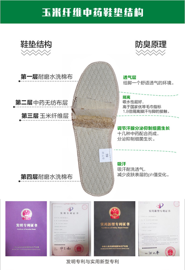 本鞋墊包含 國(guó)家專利( “玉米纖維提取”專利號(hào):5383.X),