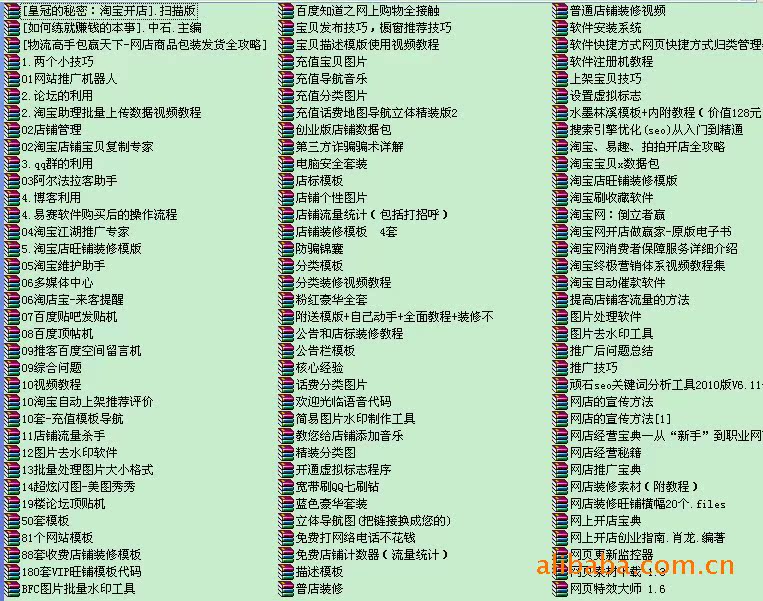 1:千戀導購網(wǎng)學習法2:SNS網(wǎng)店軟文推廣法3:SNS網(wǎng)店API合作推廣法4:收藏夾推廣法5:版主聯(lián)盟推廣法6:回復置頂推廣法7:有獎注冊推廣法8:QQ群推廣法9:搜索引擎推廣法10:軟文推廣法11:博客推廣法12:媒體推廣法13:手機推廣法14:網(wǎng)摘推廣法15:論壇推廣法16:第三極推廣法17:QQ和MSN昵稱推廣法18:郵件列表推廣法19:非預期郵件推廣法20:口碑推廣法21:口碑推廣法22:網(wǎng)店排名投票推廣法23:聚合鏈接推廣法24:BT電爐哇嘎資源推廣法25:圖片打水印推廣法26:視頻源Flash推廣法27:提交到網(wǎng)址站推廣法28:電子郵件自動回復推廣法29:無償單向鏈接推廣法30:網(wǎng)店間互換鏈接推廣法31:批量提交交換鏈接推廣法32:網(wǎng)店推廣聯(lián)盟推廣法33:流量統(tǒng)計推廣法34:互換頻道推廣法35:免費資源推廣法36:內(nèi)容聯(lián)盟推廣法37:威逼強迫推廣法38:做大做強推廣法39:客戶端軟件插件推廣法40:收費資源免費推廣法41:群組推廣法42:發(fā)布任務推廣法43:印發(fā)宣傳單線下宣傳推廣法44:流量交換聯(lián)盟推廣法45:鼓勵訪客宣傳推廣法46:名片推廣法47:電子郵件簽名推廣法48:網(wǎng)上競賽推廣法49:付費推廣法50:分工合作推廣法51:按效果付費推廣法52:設為主頁和加入收藏推廣法53:廁所繪畫推廣法54:搞活動推廣法55:廣場效應推廣法56:賀卡推廣法57:事件連鎖反應推廣法58:問答網(wǎng)店推廣法59:百科網(wǎng)店推廣法60:RSS推廣法61:網(wǎng)吧推廣法62:站長交流推廣法63:網(wǎng)頁病毒推廣法64:過路費推廣法65:域名推廣法66:分類信息推廣法67:免費域名推廣法68:聊天室推廣法6969:演講推廣法70:特殊資源推廣法71:模仿推廣法72:被動推廣法73:化整為零推廣法74:預告推廣法75:創(chuàng)建品牌推廣法76:多語言版本推廣法77:免費建站程序推廣法78:網(wǎng)店模板推廣法79:講故事出書推廣法80:創(chuàng)造新概念推廣法81:改名推廣法82:月歷墻紙推廣法83:征婚推廣法84:公交車站推廣法85:地圖推廣法86:吹捧推廣法87:出入口推廣法88:招聘推廣法89:立碑推廣法90:故事推廣法91:信仰推廣法92:贊助推廣法93:公共元素推廣法94:線下實物推廣法95:免費算命推廣法96:與朋友分享獨門秘籍推廣法97:賣站推廣法98:人工扛牌推廣法99:圖書推廣法100:免費贈送推廣法101:修電腦推廣法102:媒體聯(lián)合推廣法103:作小推廣法104:作大推廣法105:模仿推廣法106:熱點推廣法107:博客評論推廣法108:博客評論推廣法109:最后一條是無為而治重點作好站的內(nèi)容就行了