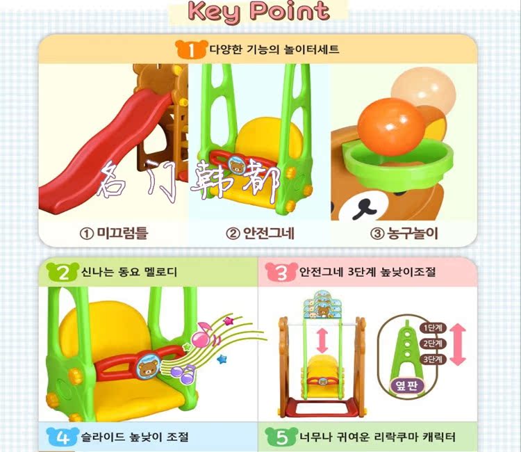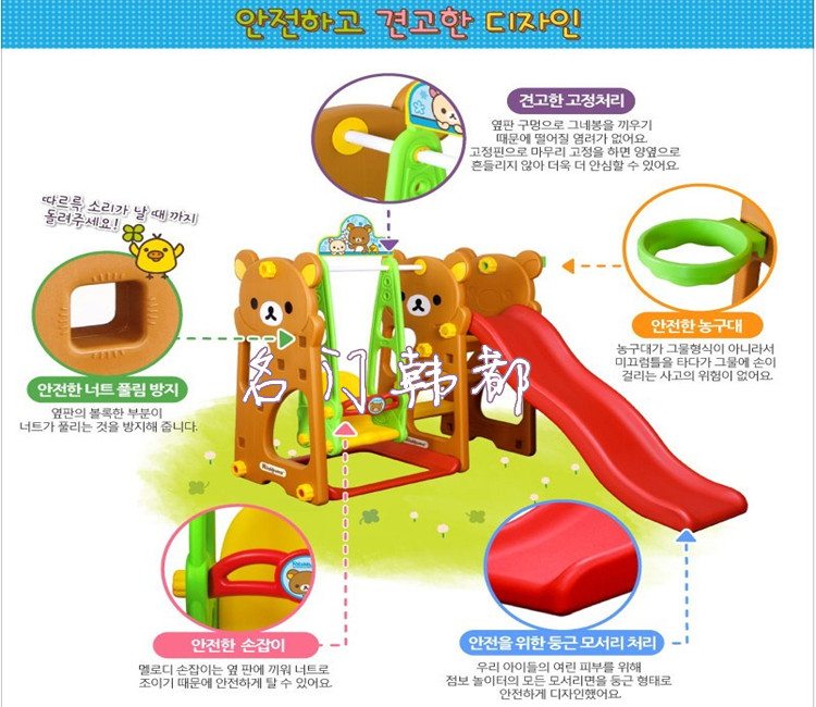 本店2013年隆重推出的一款室內(nèi)大型兒童玩具,滑梯秋千組合,采用韓國無毒環(huán)保材質(zhì),韓國原產(chǎn),為了寶寶的健康請您一定選擇正品,我們店所有商品皆為生活在韓國的店主從韓國發(fā)集裝箱到國內(nèi),全部現(xiàn)貨,歡迎團(tuán)購