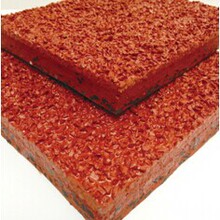 復合式塑膠跑道 :基礎層為聚氨酯樹脂粘合的黑色環(huán)保橡膠顆粒,面層為有色EPDM橡膠顆粒澆鑄在聚氨酯樹脂中。