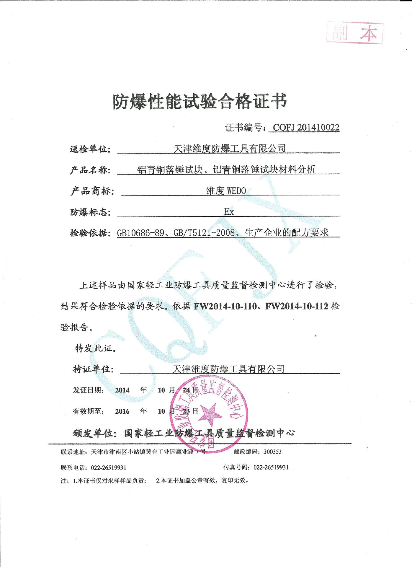 維度工具公司鄭重承諾,每個出廠產(chǎn)品均通過嚴(yán)格檢測,工藝均為當(dāng)今世界最優(yōu)技術(shù),防爆工具通過國家防爆工具質(zhì)量監(jiān)督檢測中心檢測,通過日本JISM7002-96和中國GB/T10686-2013檢測。合格率100%。所用原材料均為純度99%以上,并且本公司堅決抵制以次充好,影響使用安全的產(chǎn)品。