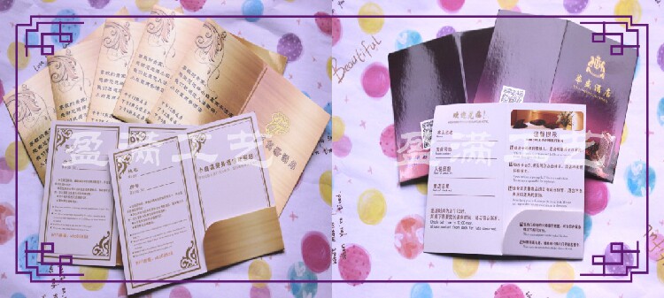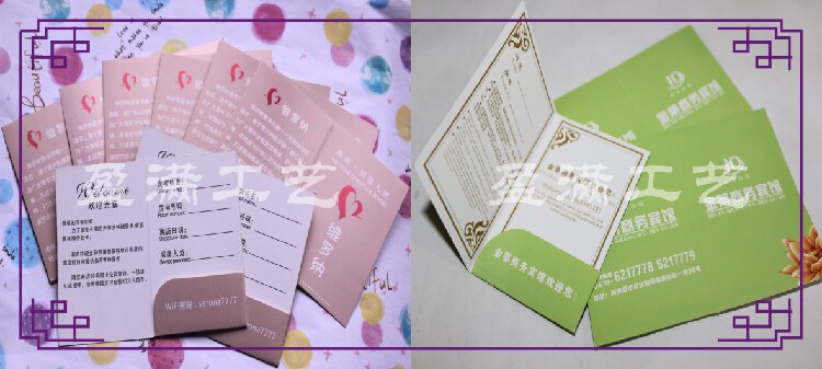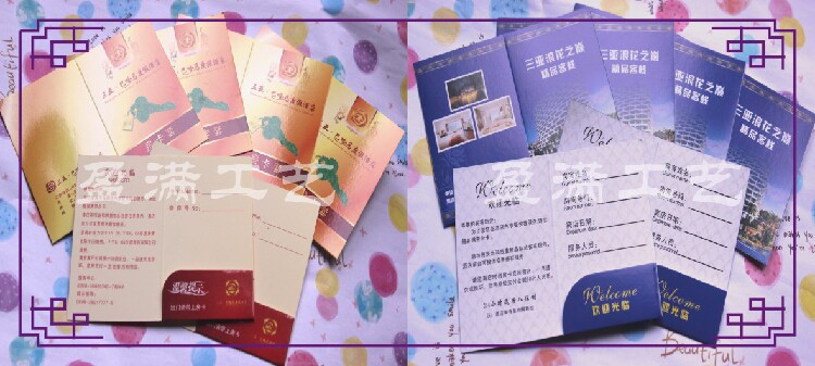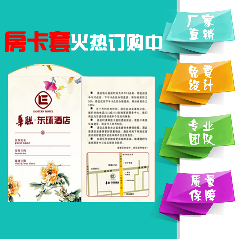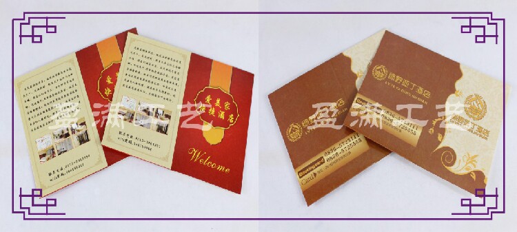 【品名】:酒店餐廳房卡套 【材料】:128克銅版紙,,120克雙膠紙,100克牛皮紙,250克白卡紙,115克珠光紙 【印刷】:四色印刷 【工藝】:腹膜 燙金 鐳射 壓紋 【工期】:成品淡季7-10天左右出貨,旺季或節(jié)假日10-15天左右出貨 (溫馨提示:請買家提前準(zhǔn)備哦?。。?【規(guī)格】:寬(6-7cm) 高度(9-11cm)以內(nèi),標(biāo)準(zhǔn)房卡套為(6*9cm)! 【包裝方式】:100只/捆,100捆/箱 紙箱外面套編織袋 防水,防散