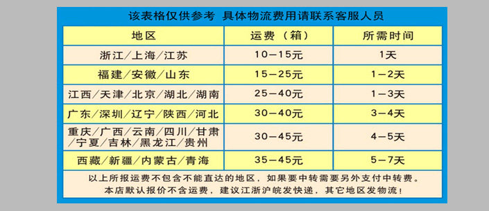 我們的產(chǎn)品報價都是不含運費不含發(fā)[piao];不同區(qū)域,不同貨運方式的運費不同,我們默認以貨的方式發(fā)貨(發(fā)物流,貨到物流點自?。?,江/浙/滬地區(qū)建議發(fā)快遞;您下單時請與我們客服確認以哪種方式發(fā)貨。我們只保證發(fā)貨的時間,不保證到貨的時間,運輸時間我們不是掌控不了的,我們會提供相應(yīng)的時間跟物流費供您參考。