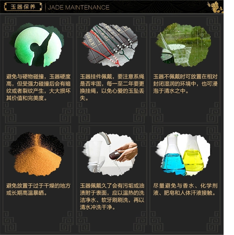 保養(yǎng)小知識:應避免與硬 物碰撞或高空摔落,防止撞裂或摔破飾體;應避免存放在高溫下或明火燒灼,以免丟失溫潤的水份;鑲嵌的翡翠飾品應經(jīng)常清洗,保持飾品的光潔和亮澤。鑲嵌的金屬物 質年久失去光澤時可以到廠家或專業(yè)維修處拋光處理 。長期不佩戴的翡翠飾品,每年可放在清水中保養(yǎng)一次,擦干水后,再適量涂點植物油進行保養(yǎng),以更好滋養(yǎng)翡翠溫潤的靈性;儲藏翡翠首飾,一般要單獨包裝,切忌和其它首飾混藏在一起,避免磨損