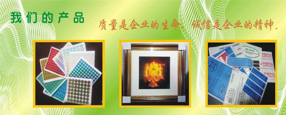 主營產(chǎn)品:防偽標(biāo)簽,不干膠商標(biāo),鐳射標(biāo)簽,激光防偽標(biāo),全息標(biāo)簽,全息圖藝術(shù)品,3D光柵片,VOID防偽標(biāo),特種印刷,數(shù)碼查詢商標(biāo),燙印標(biāo)簽,洗鋁漏空標(biāo)簽,流水號防偽標(biāo),等等。