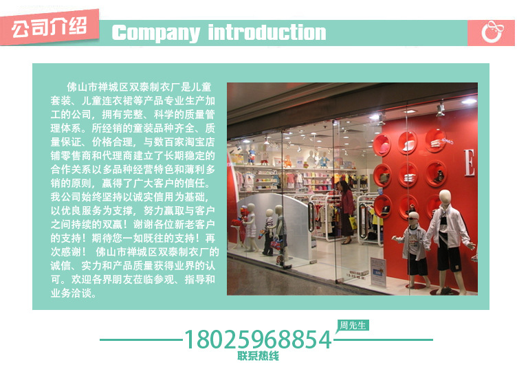 佛山市禪城區(qū)雙泰制衣廠是兒童套裝、兒童連衣裙等產(chǎn)品專業(yè)生產(chǎn)加工的公司,擁有完整、科學(xué)的質(zhì)量管理體系。所經(jīng)銷的童裝品種齊全、質(zhì)量保證、價格合理,與數(shù)百家淘寶店鋪零售商和代理商建立了長期穩(wěn)定的合作關(guān)系以多品種經(jīng)營特色和薄利多銷的原則,贏得了廣大客戶的信任。我公司始終堅持以誠實信用為基礎(chǔ),以優(yōu)良服務(wù)為支撐,努力贏取與客戶之間持續(xù)的雙贏!謝謝各位新老客戶的支持!期待您一如既往的支持!再次感謝! 佛山市禪城區(qū)雙泰制衣廠的誠信、實力和產(chǎn)品質(zhì)量獲得業(yè)界的認(rèn)可。歡迎各界朋友蒞臨參觀、指導(dǎo)和業(yè)務(wù)洽談。