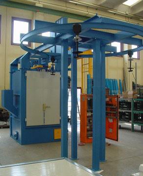 吊鉤式拋丸機分為單吊鉤和雙吊鉤,吊鉤式拋丸機由兩個吊鉤裝載工件交替進入拋丸清理室內(nèi)。利用拋丸器將0.2~0.8的彈丸拋向工件的表面,使得工件的表面達到一定的粗糙度,讓工件變得美觀,或者改變工件的壓應力提高壽命。本機型廣泛應用于鑄造、建筑、化工、電機、機床等行業(yè)的中、小型鑄、鍛件的表面清理或強化處理。吊鉤式拋丸清理機為吊鉤式清理設備,由拋丸清理室、提升機、分離器、螺旋輸送器、兩個拋丸器總成、彈丸控制系統(tǒng)、吊鉤行走軌道、吊鉤系統(tǒng)、自轉(zhuǎn)裝置、地基、除塵系統(tǒng)及電氣控制部分等組成。