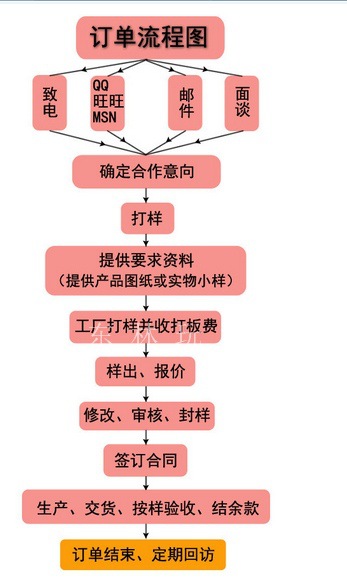 9、雙方封樣,簽訂做貨合同,常規(guī)產(chǎn)品收取全部貨款的30%預(yù)付金,特殊產(chǎn)品收取50%的預(yù)付金。