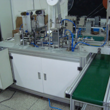 本機系以超聲波將綁帶融合于口罩本體兩側(cè),進(jìn)而完成綁帶式口罩成品,只需一名操作員將口罩本體一片片置于輸送帶冶具上, 其余動作至成品完成皆由機臺自動操作。