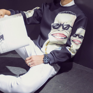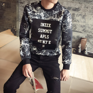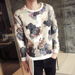 2015港風(fēng)秋裝型男夜店酒吧 休閑太空棉長袖圓領(lǐng)玫瑰印花套頭衛(wèi)衣