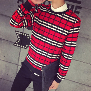 2015秋裝型男校園個(gè)性美發(fā)師 休閑格子衛(wèi)衣大牌 修身圓領(lǐng)潮男