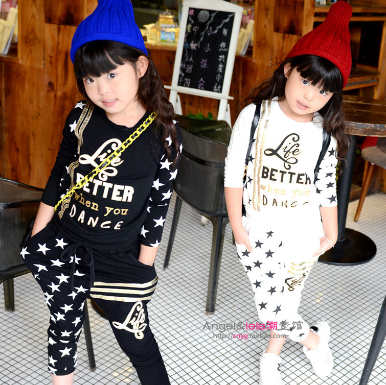韓版黑色金邊字母星星T恤 星星垮褲休閑套裝 2015春款童裝批發(fā)