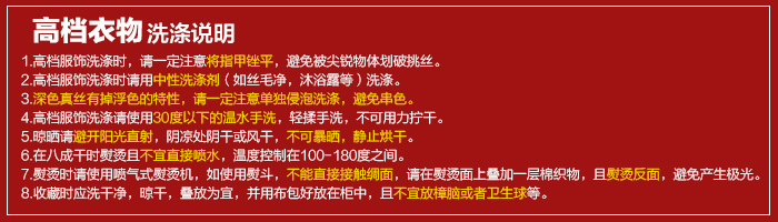 6. 本店出售的是高端女裝,大部分真絲面料產(chǎn)品建議干洗!真絲質(zhì)地嬌弱,不能用強烈的化學(xué)洗滌用品進行用力揉搓,應(yīng)用洗潔 精或?qū)iT洗滌真絲衣物的產(chǎn)品,如真絲面料因洗滌出現(xiàn)的問題,請恕本店概不退換!同時要注意深色衣服和淺色衣服一定要分 開洗!