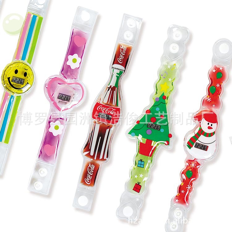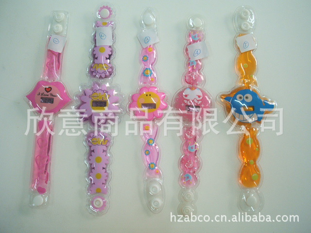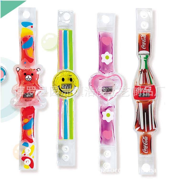 功能:表帶,表面,可按要求定制款式與印刷;帶時間功能,內(nèi)入液體,油色鮮艷,并帶漂浮物有趣。