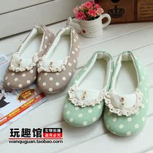 小清新森女系~甜美波點(diǎn)木扣蕾絲月子鞋 軟底瑜伽鞋 全棉家居拖鞋
