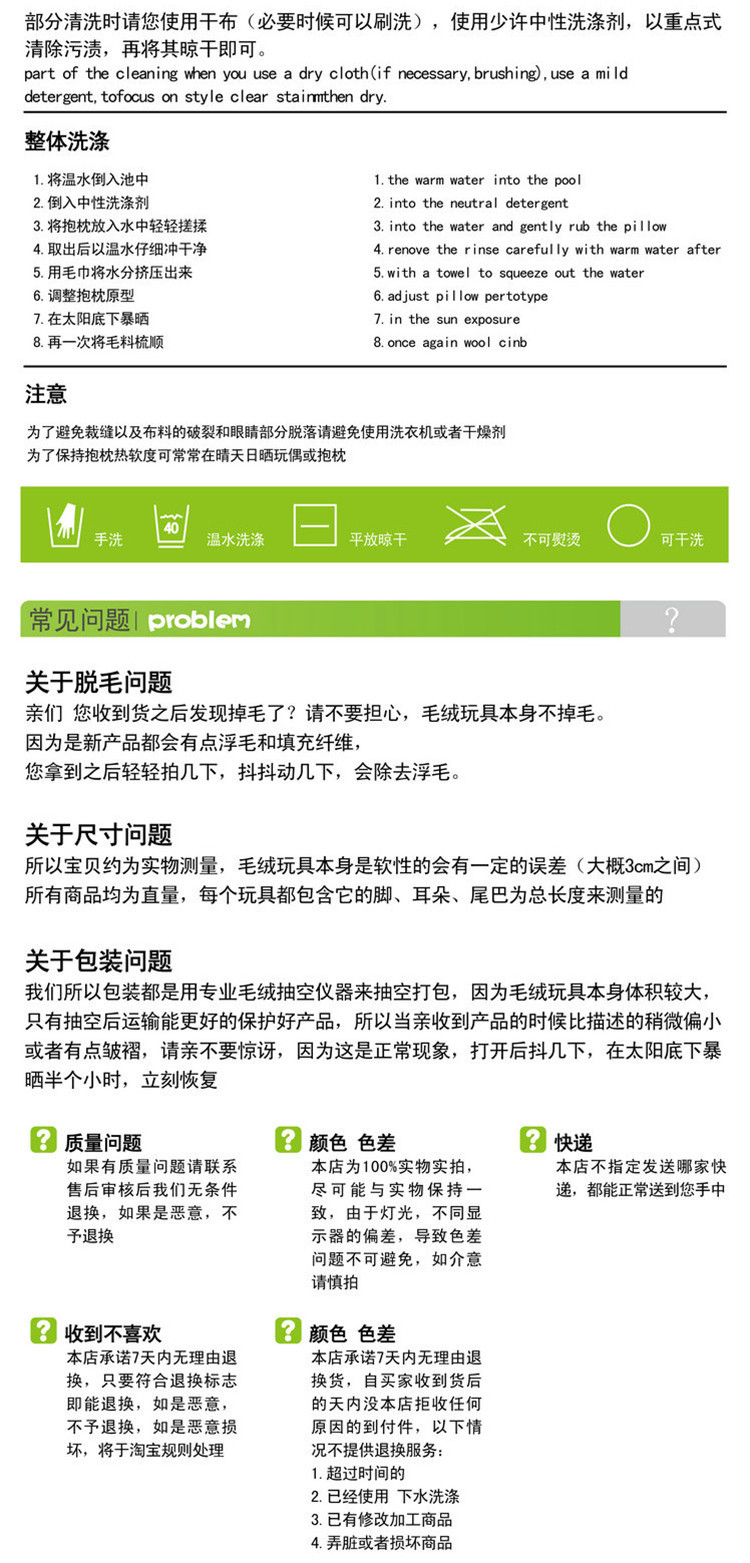 4、本身是毛繞玩具,不排除玩具上面會(huì)有浮毛,這個(gè)是正常的情況,不是掉毛,請(qǐng)親們放心采購(gòu),我們的質(zhì)量都是很好的,