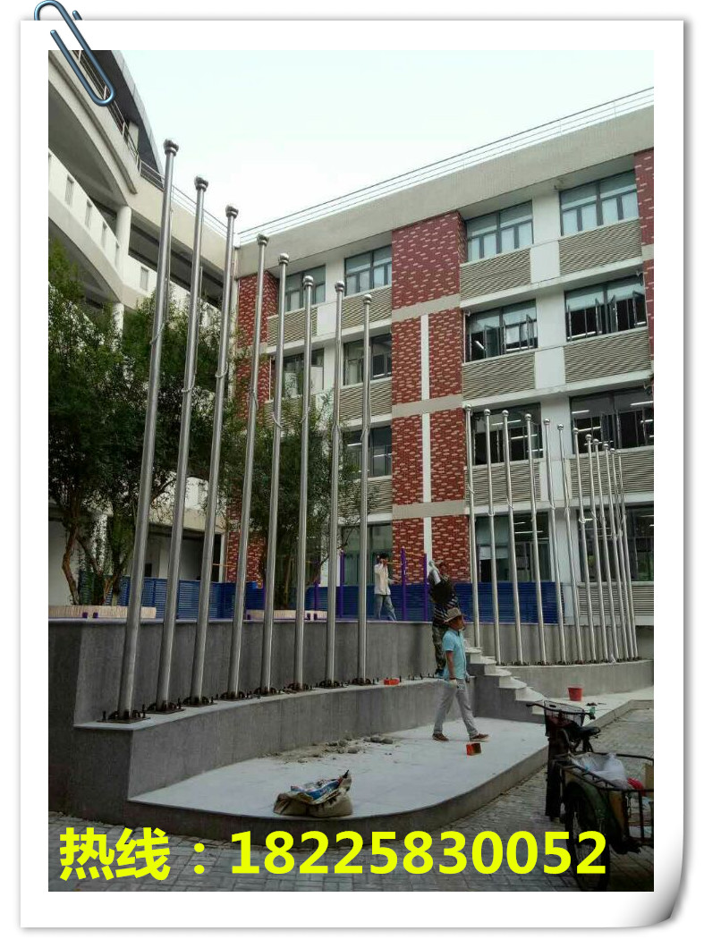 A、旗桿外形挺拔壯觀,根據(jù)實(shí)際高度或者客戶要求,由(1—6)截不同直徑的不銹鋼管焊接而成。 B、變徑處圓潤(rùn)光滑,結(jié)實(shí)牢固,套管皆為不銹鋼304材料。