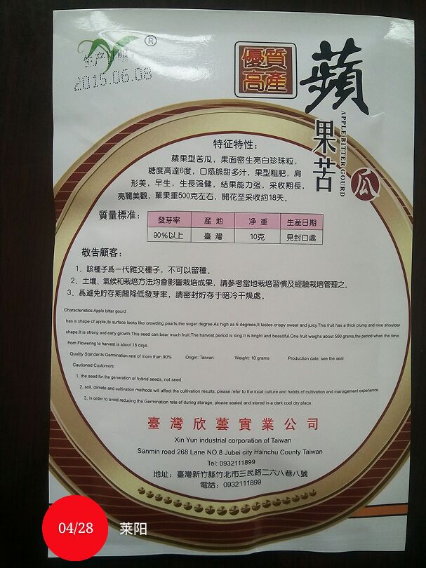 一代交配品種臺灣蘋果苦瓜種子,蘋果型苦瓜,果面密生亮白珍珠粒,糖度高達(dá)6度,口感脆甜多汁,果型粗肥,肩形美,早生,生長強(qiáng)健,結(jié)果能力強(qiáng),采收期長,亮麗美觀,單果重500克左右,開花至采收約18天。較抗**病和霜霉病,葉綠色,莖稈粗壯,長勢強(qiáng)健,結(jié)瓜率高;瓜苦味稍淡、爽脆可口,鮮食、炒食均可。露地栽培產(chǎn)量667平方米高可達(dá)3500kg,大棚栽培產(chǎn)量可達(dá)4000kg以上。生長期210~240天,結(jié)果期180~210天。 水果苦瓜跟其他的苦瓜 比,它的苦味不那么濃,苦味要淡一點(diǎn)水果苦瓜味道清淡,更適合生食苦瓜個大,而且每個節(jié)間都有瓜,這是它與普通苦瓜的不同之處,此外,它生長勢旺,坐果能力強(qiáng),產(chǎn)量穩(wěn)定,抗病性好。 蘋果苦瓜營養(yǎng)豐富,所含蛋白質(zhì)、脂肪、碳水化合物等在瓜類蔬菜中較高,特別是維生素C含量,每百克高達(dá)84毫克,約為冬瓜的5倍,黃瓜的14倍,南瓜的21倍,居瓜類之冠。