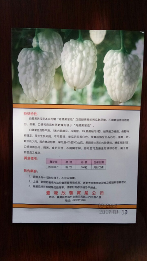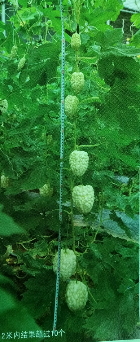一代交配品種臺灣蘋果苦瓜種子,蘋果型苦瓜,果面密生亮白珍珠粒,糖度高達6度,口感脆甜多汁,果型粗肥,肩形美,早生,生長強健,結(jié)果能力強,采收期長,亮麗美觀,單果重500克左右,開花至采收約18天。較抗白粉病和霜霉病,葉綠色,莖稈粗壯,長勢強健,結(jié)瓜率高;瓜苦味稍淡、爽脆可口,鮮食、炒食均可。露地栽培產(chǎn)量667平方米最高可達3500kg,大棚栽培產(chǎn)量可達4000kg以上。生長期210~240天,結(jié)果期180~210天。 水果苦瓜跟其他的苦瓜 比,它的苦味不那么濃,苦味要淡一點水果苦瓜味道清淡,更適合生食苦瓜個大,而且每個節(jié)間都有瓜,這是它與普通苦瓜的不同之處,此外,它生長勢旺,坐果能力強,產(chǎn)量穩(wěn)定,抗病性好。 蘋果苦瓜營養(yǎng)豐富,所含蛋白質(zhì)、脂肪、碳水化合物等在瓜類蔬菜中較高,特別是維生素C含量,每百克高達84毫克,約為冬瓜的5倍,黃瓜的14倍,南瓜的21倍,居瓜類之冠。