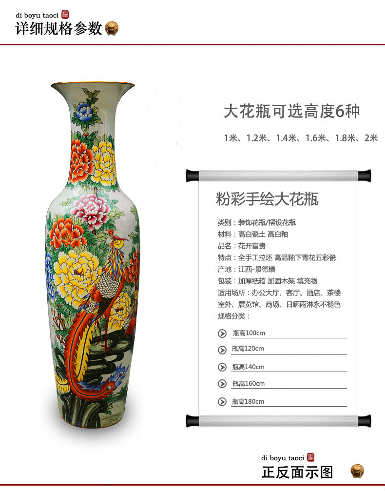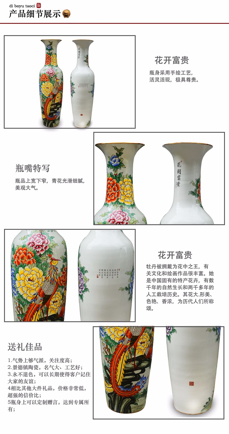 落地大花瓶是一種陶瓷工藝品,用它來裝扮空間也成為現(xiàn)在的流行趨勢。落地大花瓶外表精美,且表面光滑,摸上去非常有質(zhì)感,所以不管是您自己用還是送人,落地大花瓶都會(huì)給人一種高端大氣上檔次的感覺。景德鎮(zhèn)市合元陶瓷有限公司就是專門定制落地大花瓶的廠家,規(guī)格有1米-3.6米,款式多樣,圖案豐富。落地大花瓶有青花、粉彩、色釉等圖案,采用純手工拉坯制作,可私人訂制?。?!