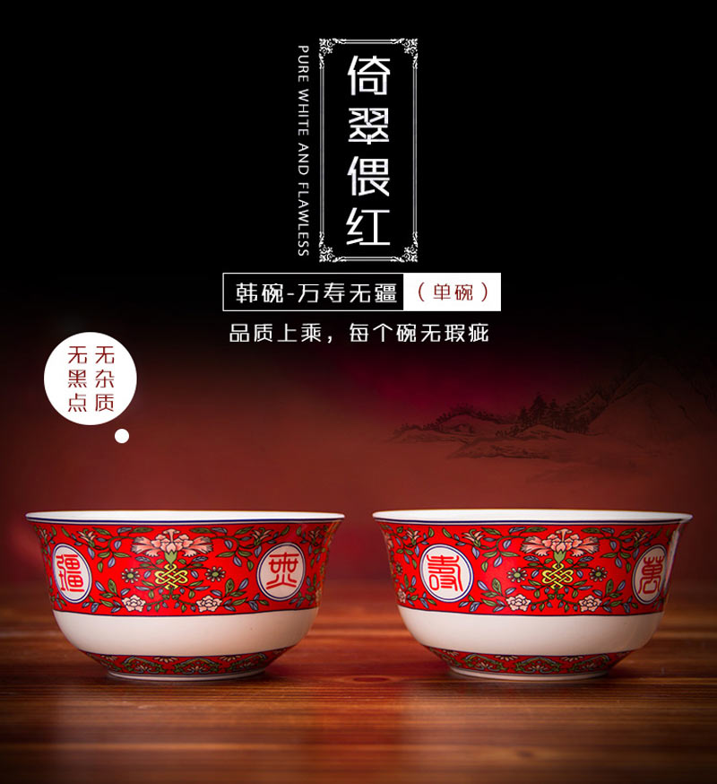 長輩們過生日也叫作過壽,傳說紅色可以辟邪水災(zāi),所以許多人喜歡將家中老人壽誕上的壽碗定做成紅色,圖一個好的寓意!景德鎮(zhèn)市合元陶瓷有限公司專業(yè)定做景德鎮(zhèn)壽碗,專業(yè)設(shè)計團隊根據(jù)客戶的需求設(shè)計不同的壽碗。景德鎮(zhèn)壽碗采用傳統(tǒng)手法和現(xiàn)代工藝相結(jié)合,精選不掉色花紙,顏色純正,畫面清晰。景德鎮(zhèn)壽碗選用優(yōu)質(zhì)骨質(zhì)瓷制作,使得胎體晶瑩剔透,深的廣大客戶的喜愛。專業(yè)定做的景德鎮(zhèn)壽碗款式齊全,顏色鮮艷,有中國紅、帝王黃、鑲金邊、青花斗彩等。景德鎮(zhèn)壽碗都是經(jīng)過高溫?zé)?,健康環(huán)保、顯富貴喜慶,可加字及圖案、照片等等。