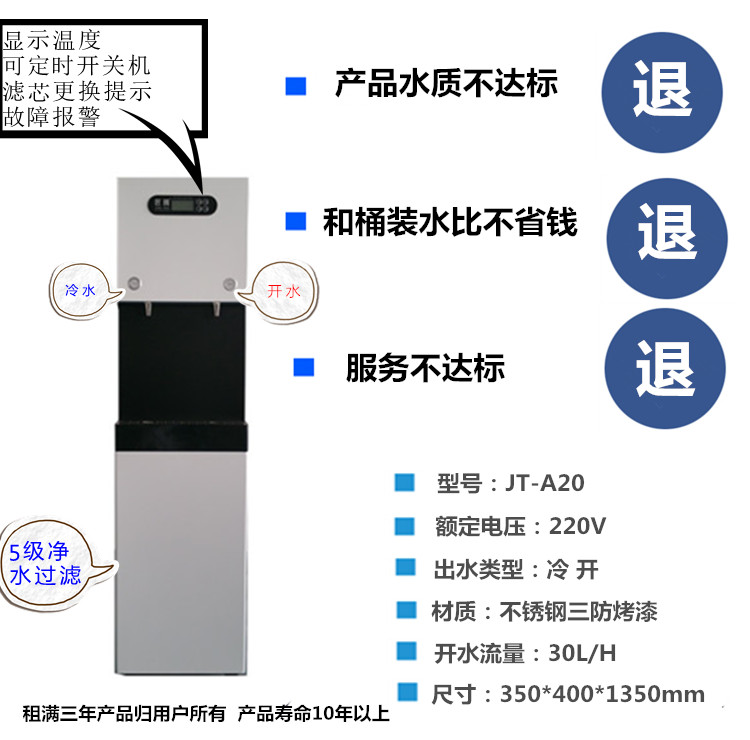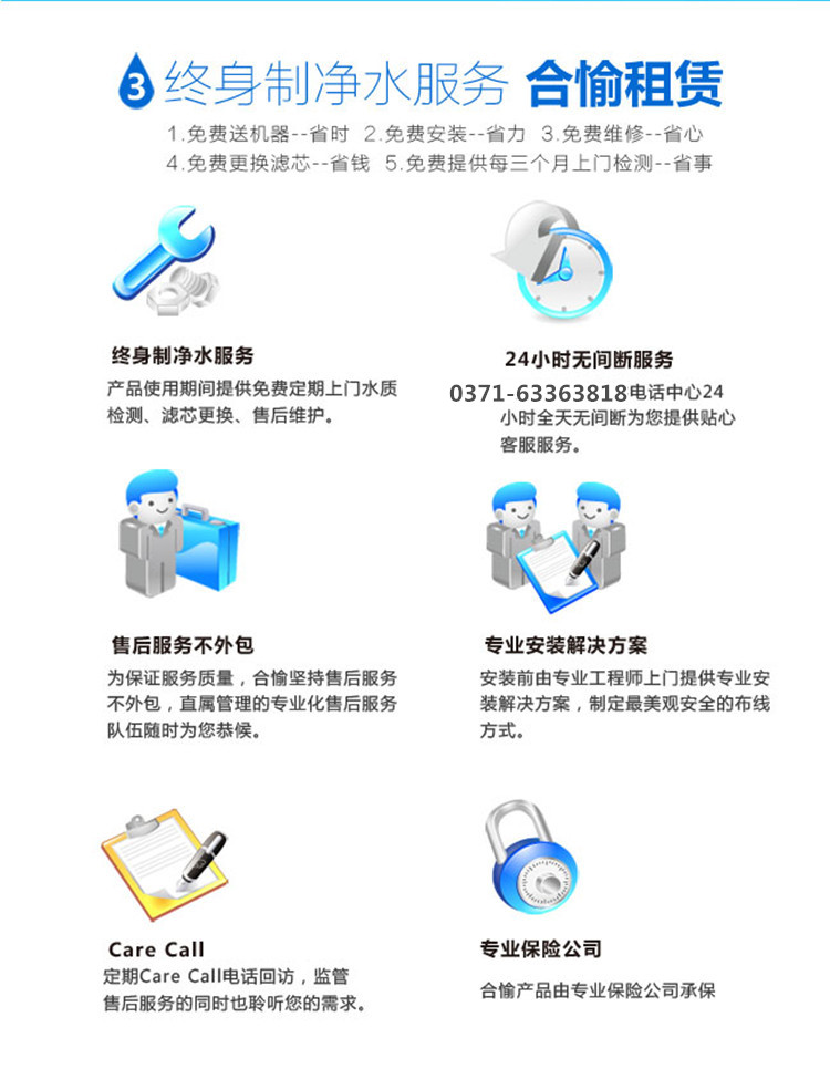 3保證服務(wù)質(zhì)量:根據(jù)原水水質(zhì)每3-6個(gè)月更換1/2/3級濾芯,8-12個(gè)月更換5級濾芯,15-24個(gè)月更換4級濾芯,租賃期內(nèi),所有耗材及配件均有我公司免費(fèi)提供,租滿三年后直飲機(jī)歸用戶所有,產(chǎn)品壽命均在10年以上