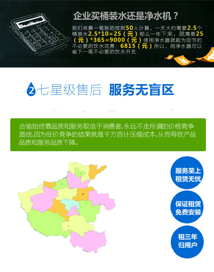 鄭州專業(yè)租賃飲水機(jī)、租賃開水器、租賃直飲水設(shè)備、租賃凈水器、適用于:鄭州辦公室、企業(yè)、單位、工廠、醫(yī)院、機(jī)關(guān)單位,只要一天花幾元錢,就能解決20-50人飲水問題,不是每一家租賃商用直飲機(jī)的商家說話都這么硬氣!
