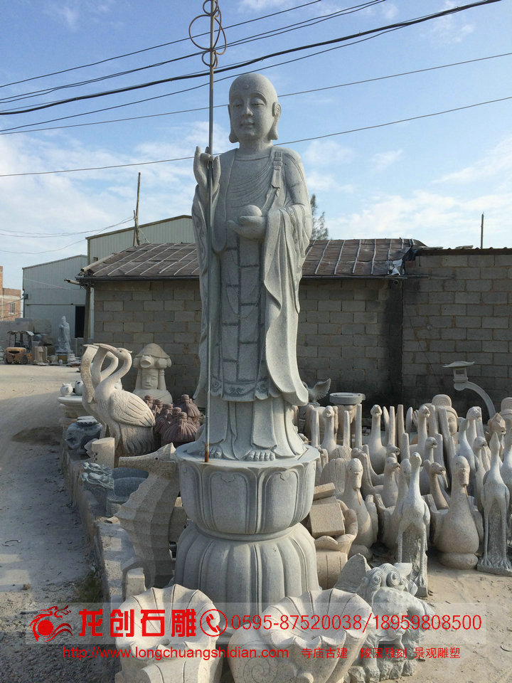 中國佛教寺院中的地藏菩薩形象也很有特性,普通菩薩為頭戴寶冠、身披天衣、瓔珞裝飾的天人相。而地藏菩薩則多為光頭或是頭戴毗盧冠,身披袈裟的出家僧人之相。一手持錫杖,一手持蓮花,或是手持幡幢、寶珠等。據(jù)《地藏菩薩儀軌》、《地藏菩薩十輪經(jīng)》等記,由于地藏菩薩在無佛的“五濁惡世”(即劫濁、見濁、懊惱濁、眾生濁、命濁)中濟渡眾生,為了讓眾生能堅信因果,歸依三寶,所以顯現(xiàn)出家僧人相。