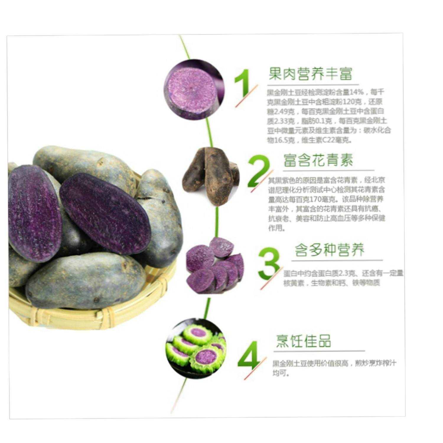黑土豆花青素含量48.4mg∕100g鮮薯、抗氧化活性物質(zhì)高于一般品種,有延緩衰老等作用。適于大棚等保護(hù)地栽培。