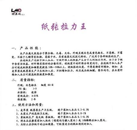 在造紙生產(chǎn)過(guò)程中加入本品,可使纖維上的羥基產(chǎn)生分子之間相互作用。由于分子鏈中含有活性基,對(duì)纖維有很好的分散作用,使紙漿中的纖維分布更均勻。在造紙中加入本產(chǎn)品可使成紙強(qiáng)度和撕裂度提高30%—90%以上,使紙張的白度,平滑度都有所增加。例如:在麥草漿或脫墨漿生產(chǎn)衛(wèi)生紙加入后,不但增加拉力,而且成品紙細(xì)膩,整齊均勻。在木漿纖維加入本品可提高紙張挺度和強(qiáng)度。